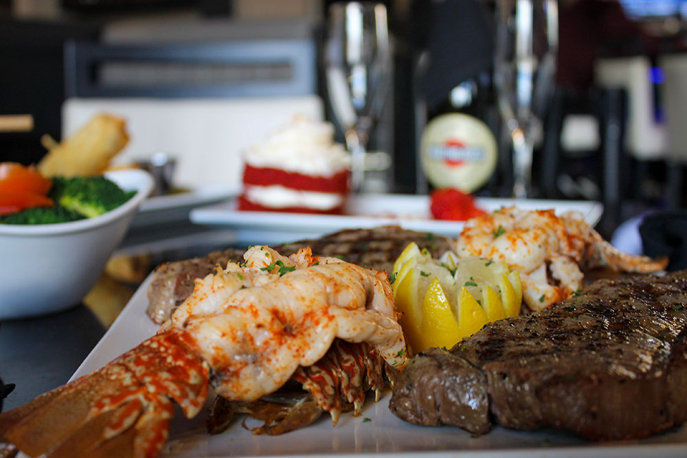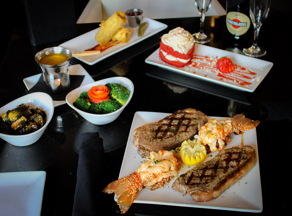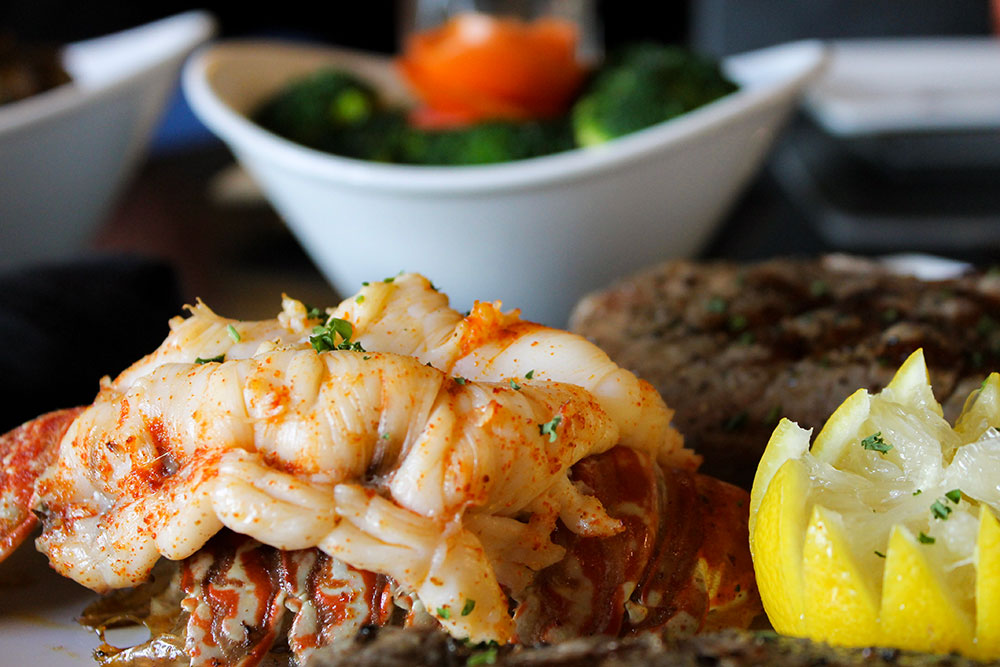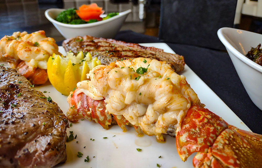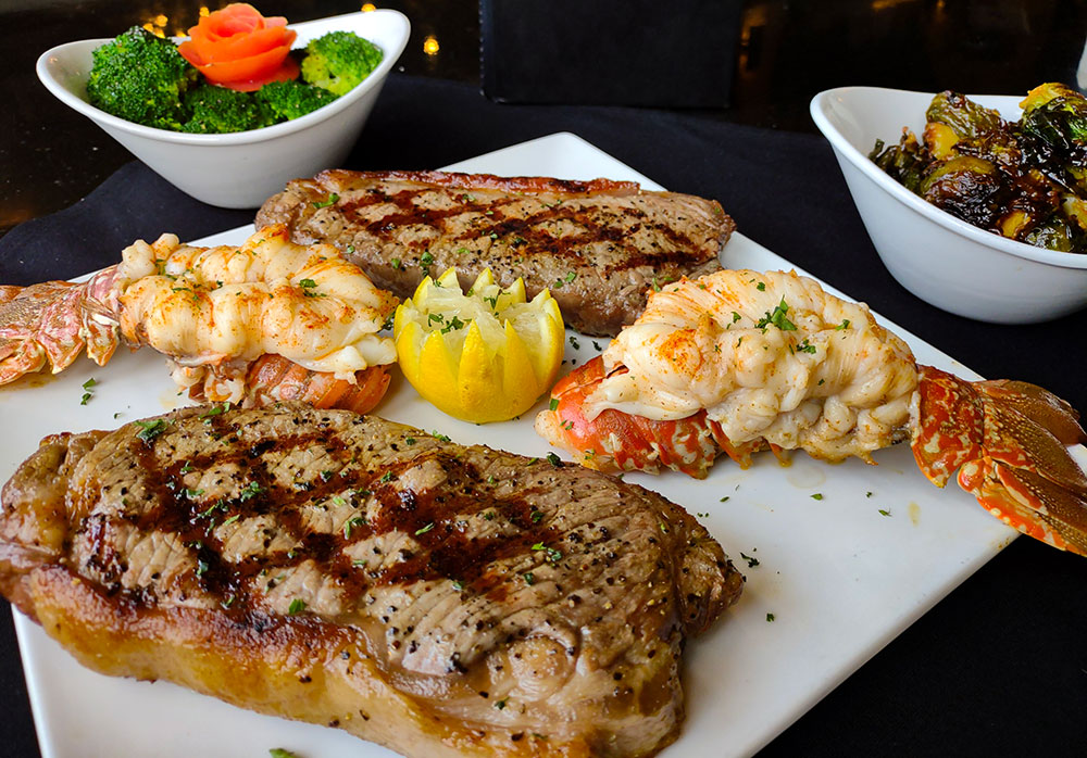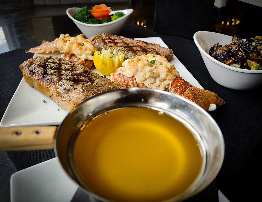 2- NY Strip Steaks with 2- South a African Lobster Tails and Choice of Two Sides to Share