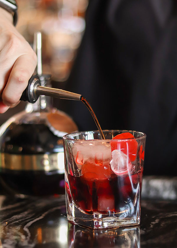 Fat Washed Woodford Reserve Bourbon, Black Walnut Bitters, House Made Grenadine, Bourdeaux Cherry