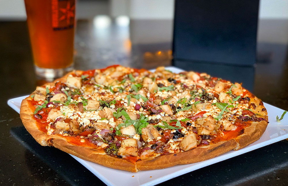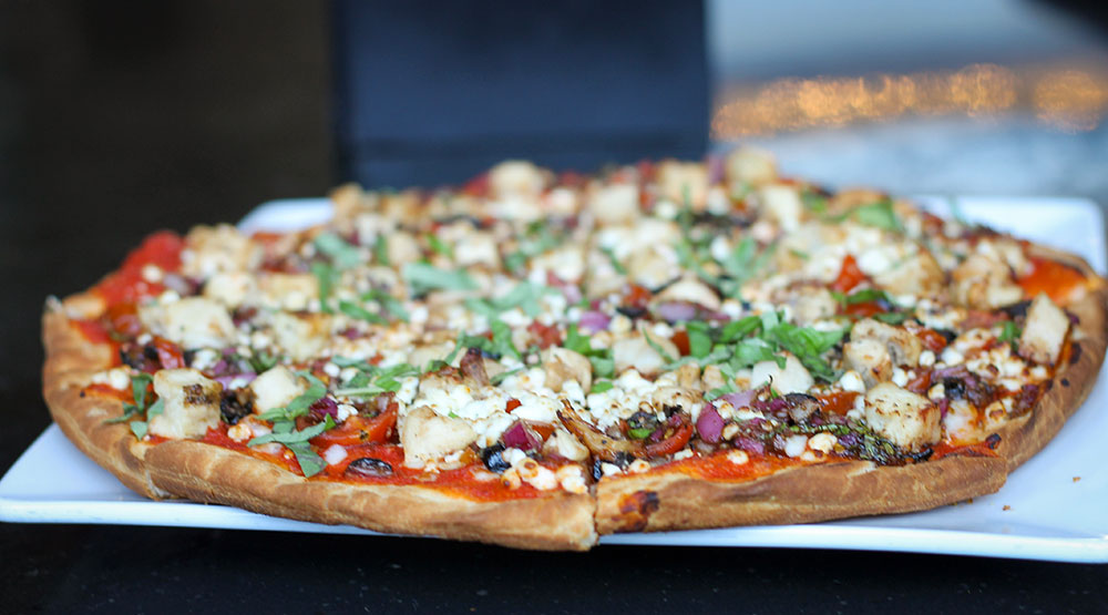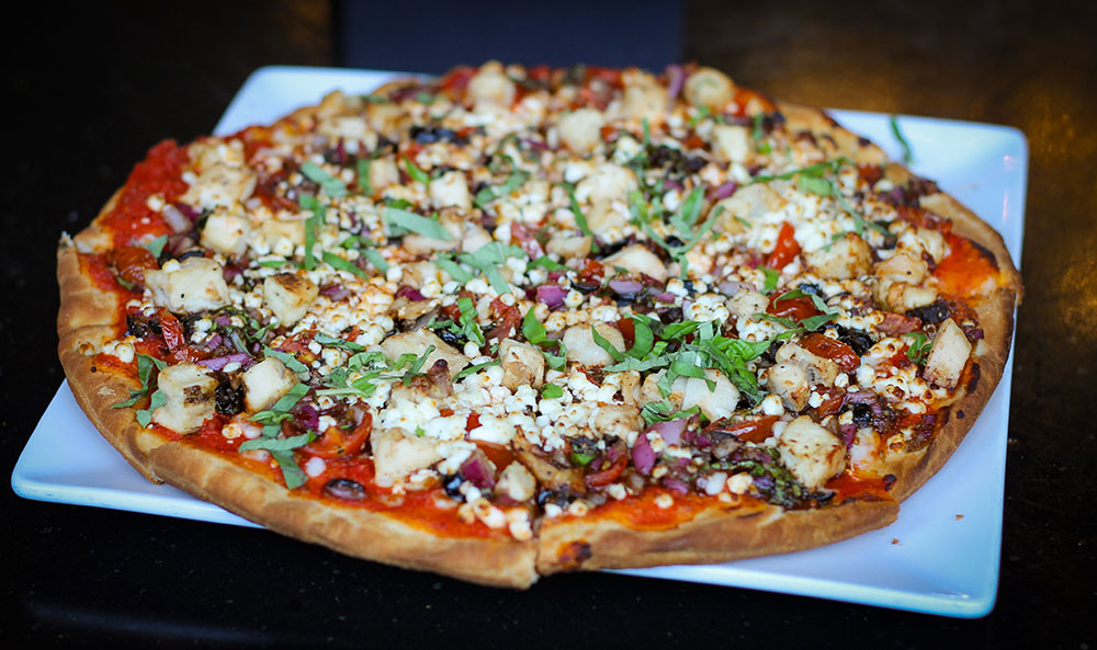 Imagine a crispy, thin crust topped with succulent GRILLED CHICKEN, sweet CHERRY TOMATOES bursting with flavor, a sprinkle of ONION for that zesty kick, and the perfect blend of MOZZARELLA and GOAT CHEESE, creating a creamy, dreamy cheese heaven.