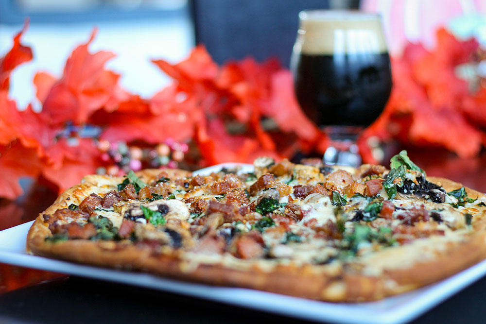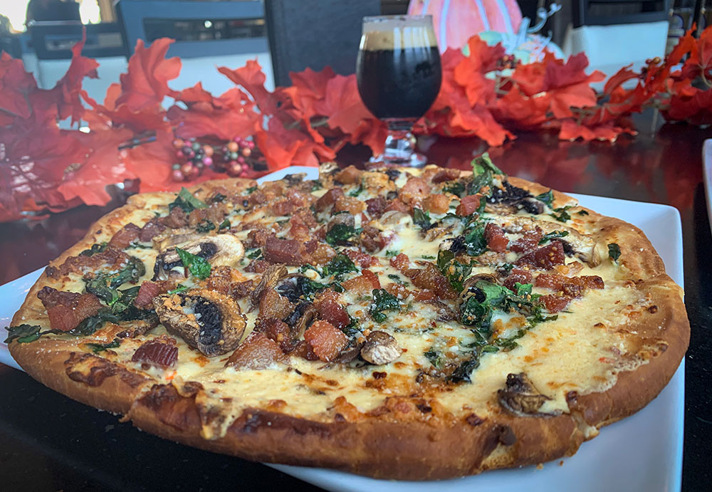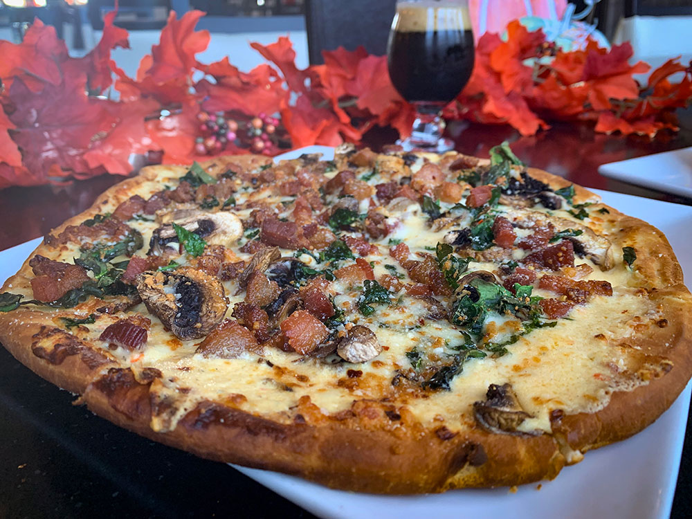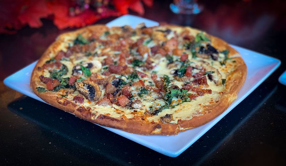 We start with our fabulous SG pizza crust topped with our roasted red pepper Alfredo sauce, spinach, mushrooms, pork belly, red pepper flakes and finally an abundance of Mozzarella & Parmesan cheeses!
