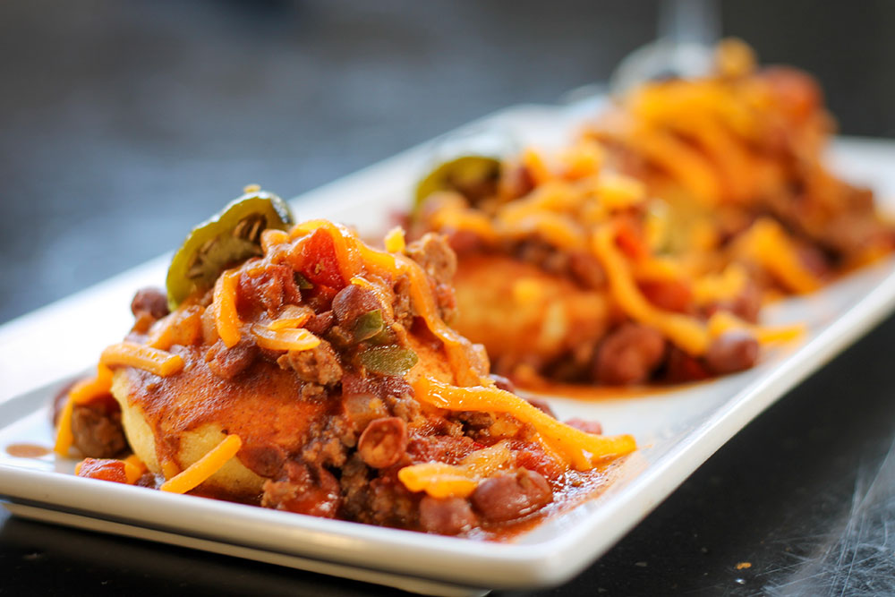 ✓Chili Cornbread Cakes – topped with house chili, Cheddar and grilled jalapeño. 😁