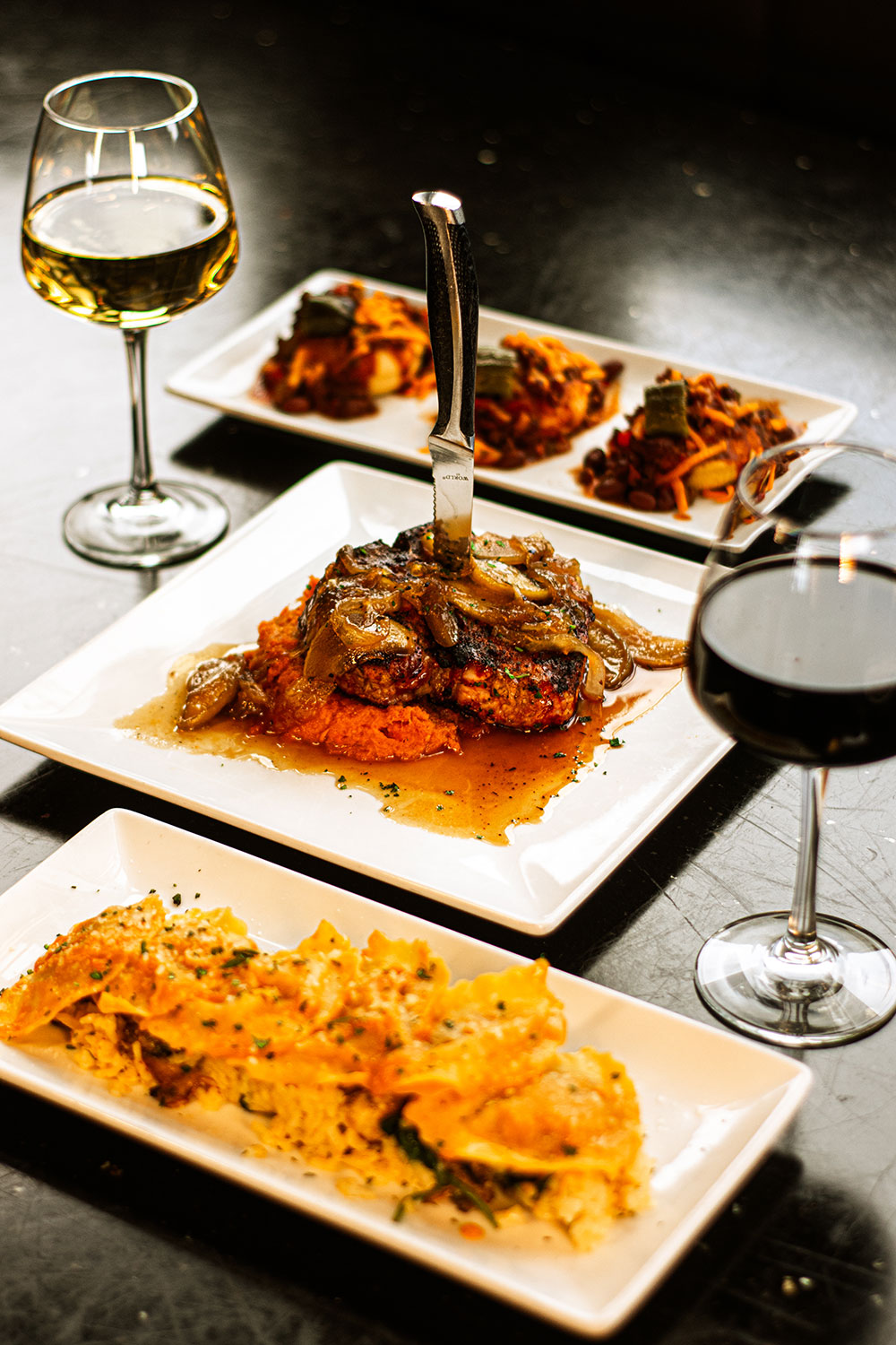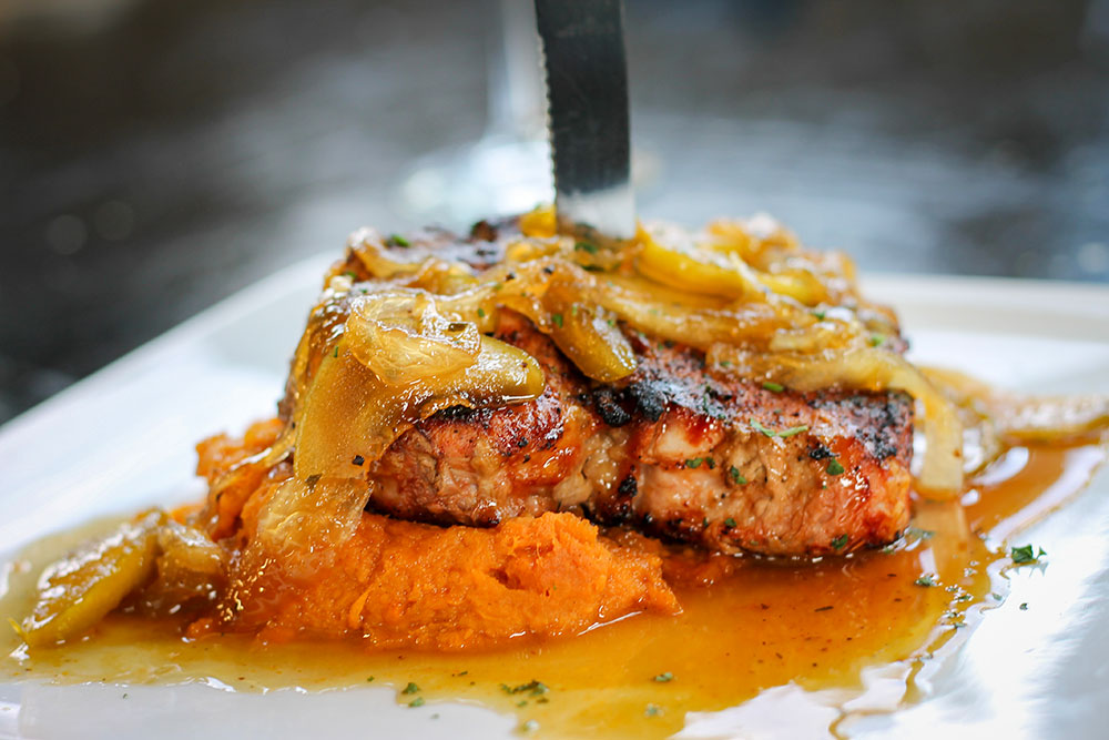 ✓Pork Porterhouse – grilled medium well with an apple brown sugar glaze on top of sweet mashed potatoes with choice of soup or salad. 🍖 🍎